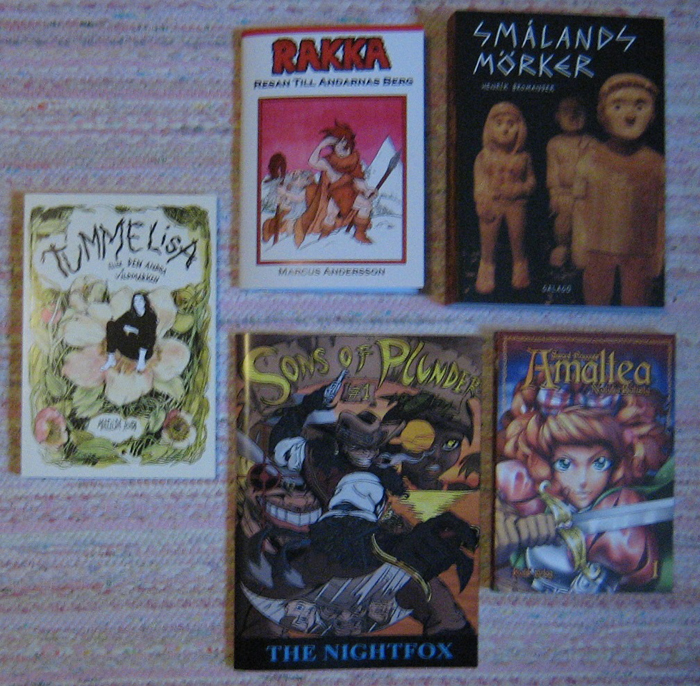 Några inköp var planerade redan innan, men hälften glömde jag bort och gjorde därför en ny lista när jag väl satt på SPX. Även denna lista glömde jag bort mycket av. Köpte lite fler saker än de på bilden, men jag tänkte fokusera på dessa för att... För att. Rakka är tecknad av min gode vän Marcus Andersson, så det var ett givet köp. Lika så min bordsgranne och gamle skolkamrat CH´s skapelse Sons of Plunder (som jag har väntat på i åratal på att få se in action). Tummelisa eller den andra vildmarken var inget som jag sett tidigare men jag fastnade enormt efter att ha bläddrat lite. Fenomenalt tecknat (av Matilda Ruta).