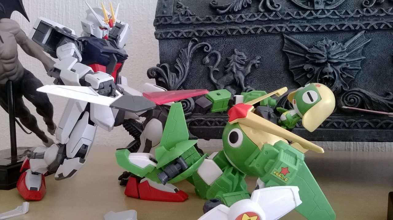 Har inte hunnit lägga upp blogginlägg som jag velat eftersom min surfplatta krånglar med uppladdning av bilder plus att jag har haft en massa annat denna vecka. Anyway, jag lämnar upp för herr Aronsson att ta över bloggen denna vecka och delar med mig av en bild på ett par av mina figurer jag har hemma. På bilden syns Strike Force Gundam och Keroro plus robot.